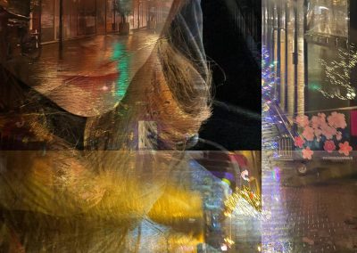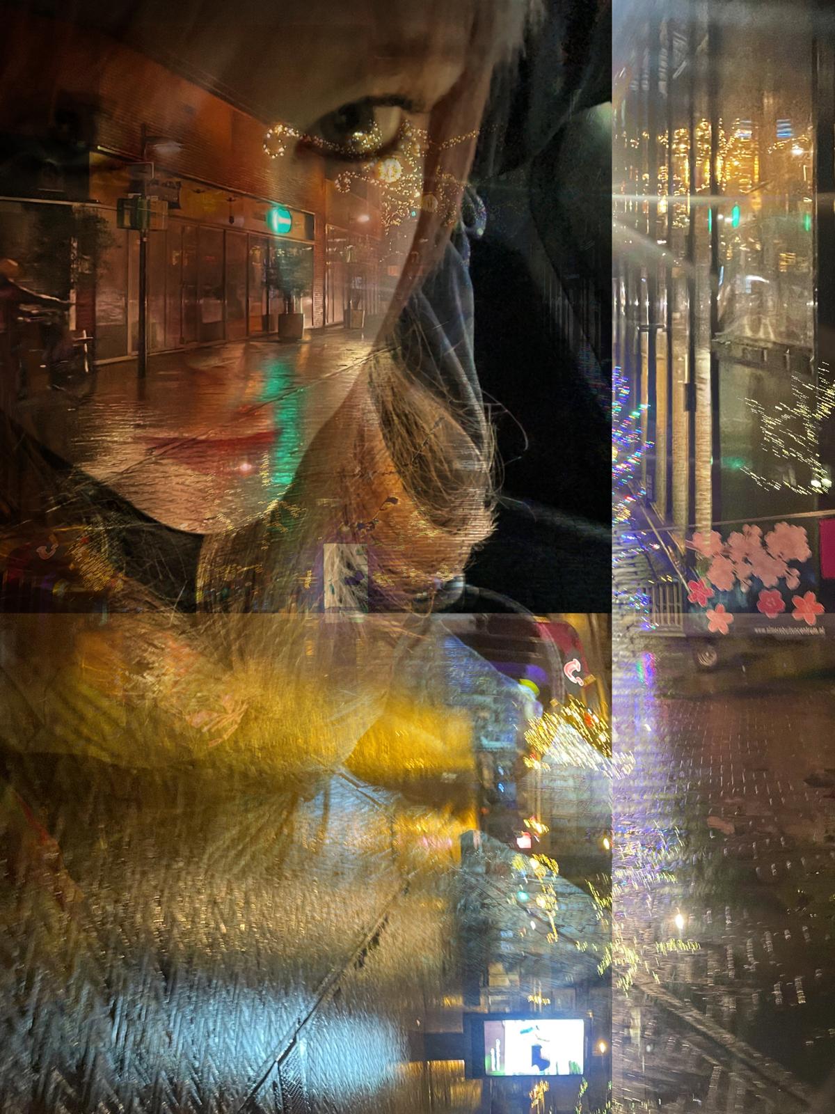 Hier doe ik hetzelfde, dit is een foto van mijzelf maar daarin verwerkt 4 andere foto’s van Almere in de avond die ik dan bewerk en blend met mijn eigen foto voor een leuk geheel